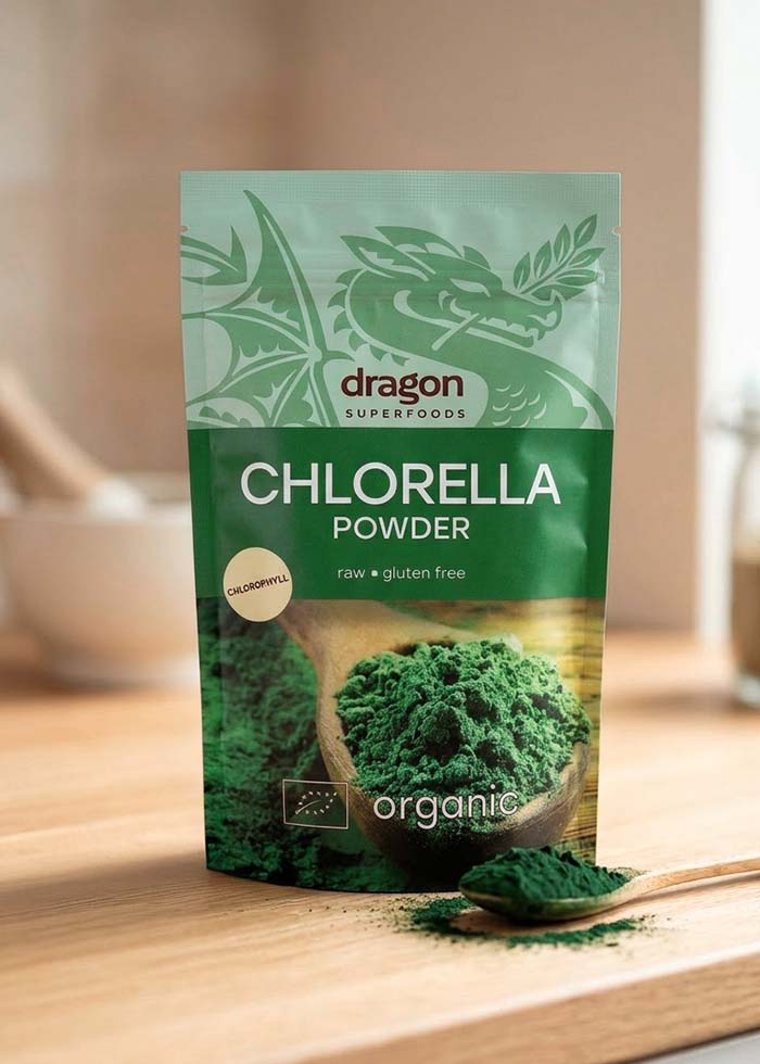 Økologisk og vegansk chlorella pulver. Pulveret fremstilles af mikroskopiske ferskvandsalger og har et højt indhold af klorofyl, som giver en intens grøn farve. Smagen er kraftig, men pulveret kan nemt integreres i smoothies, juice, morgenmad, humus eller andre retter for at mildne smagen og tilføre næringsstoffer. Det kan også røres direkte op i vand for et hurtigt grønt tilskud. Uden pesticidrester, kunstige sødestoffer eller aromaer.