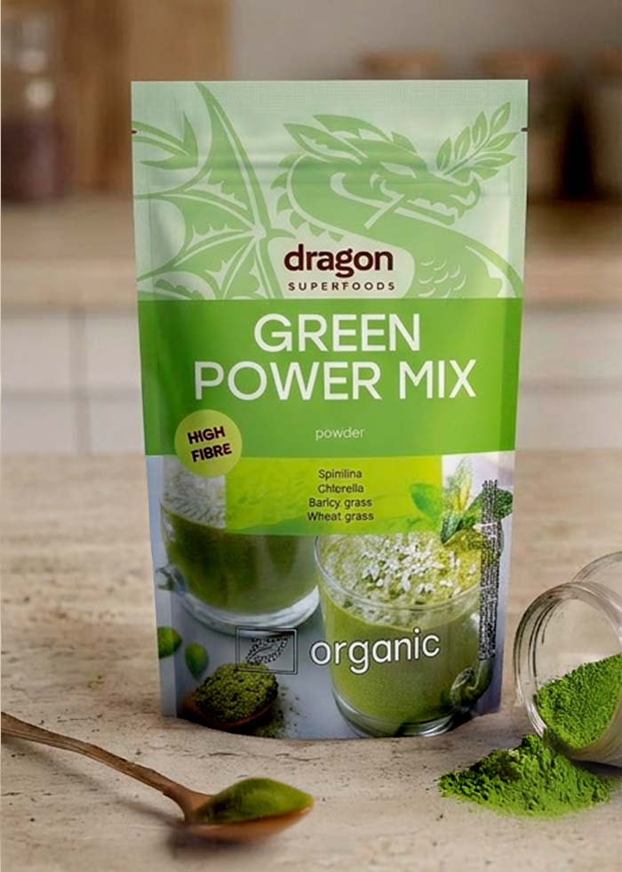 Økologisk Green Power Mix Pulver – vegansk og glutenfri. Et næringsrigt blend af spirulina, chlorella, byggræs og hvedegræs, alle rige på klorofyl og naturlige næringsstoffer. Pulveret har en levende grøn farve og kan anvendes i smoothies, juice, yoghurt, morgengrød, sammenkogte retter, fars, bagværk, brød, kager eller energibarer.
