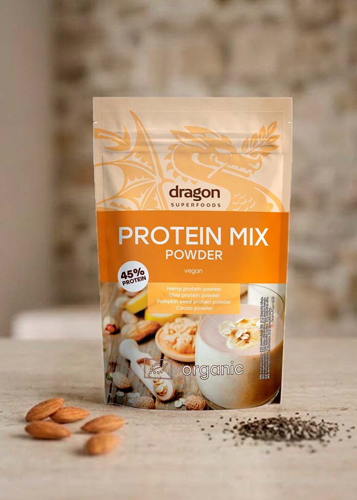 Protein Mix økologisk, glutenfrit og vegansk – kraftfuldt, plantebaseret proteinpulver. Produktet kombinerer hamp-, chia- og græskarprotein med kvalitetskakao for en nøddeagtig og intens smag. Protein Mix indeholder alle essentielle aminosyrer og fungerer som et praktisk tilskud før eller efter træning, i smoothies, shakes eller morgenmåltider. Pulveret er uden tilsat sukker og nemt at integrere i en plantebaseret kost som energiboost og proteinrige måltider.