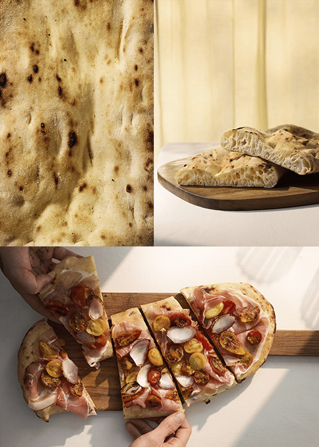 Bagt med økologiske melsorter af højeste kvalitet fra Italien og vores egen surdej, er pinsaen skabt til at løfte enhver servering. Den lange hævetid og bagning i stenovn sikrer en smagsoplevelse ud over det sædvanlige – sej, saftig og fyldt med karakter.