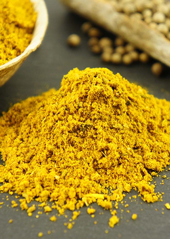 Gurkemeje*, koriander*, bukkehornsfrø*, cassia*, spidskommen*, ingefær*, sort peber*, kardemomme*, nelliker*.